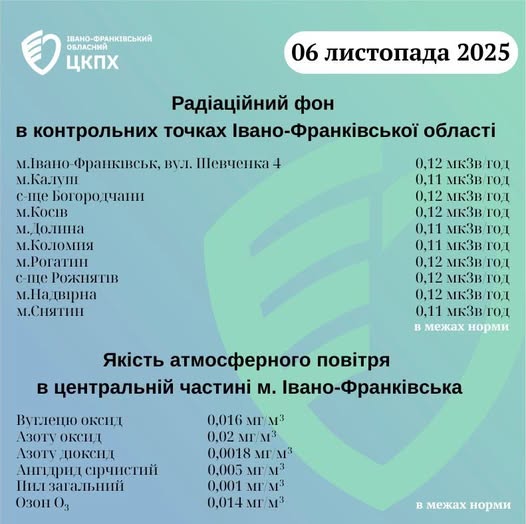 Станом на ранок 06.11.2025 показники радіаційного фону в Івано-Франківській області становлять від 0,11 мкЗв/год до 0,12 мкЗв/год, що не перевищує природний радіаційний фон характерний для Прикарпаття (0,32 мкЗв/год). Пише Голос-Інфо, […]