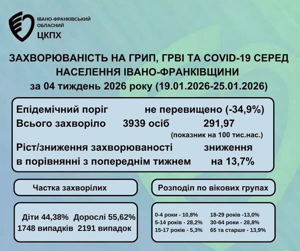 За даними аналізу захворюваності впродовж 4 тижня 2026 року (епідсезон 2025–2026 рр.) на ГРВІ, грип та COVID-19 захворіли 3939 осіб, у тому числі 1748 дітей віком 0–17 років (44,38%). Пише […]