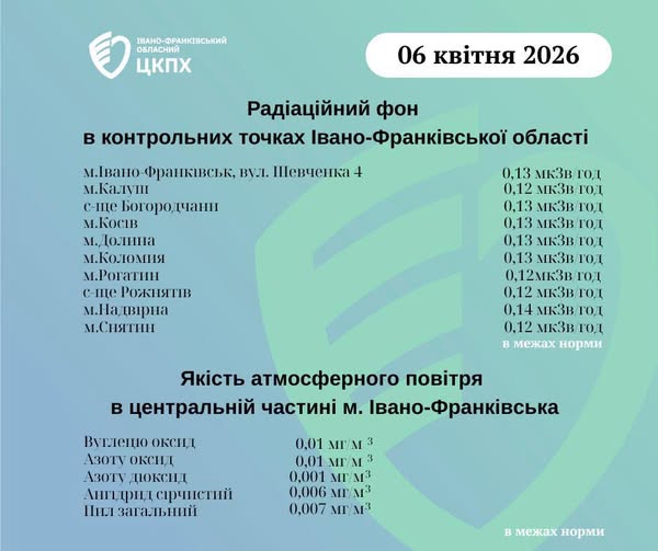 Станом на ранок 06.04.2026 показники радіаційного фону в Івано-Франківській області становлять від 0,12 мкЗв/год до 0,14 мкЗв/год, що не перевищує природний радіаційний фон характерний для Прикарпаття (0,32 мкЗв/год). Пише Голос-Інфо, […]