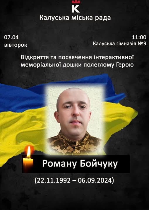 У вівторок, 7 квітня, на території Калуської гімназії №9 відбудеться відкриття та посвячення інтерактивної меморіальної дошки на честь полеглого Захисника України Романа Бойчука. Початок заходу запланований на 11:00. Про це […]