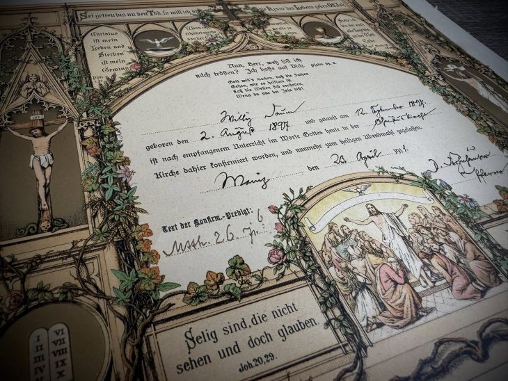 Грамота містить індивідуальні відомості про особу: дату народження (2 серпня 1897 року), дату хрещення (12 грудня 1897 року), а також дату і місце конфірмації — 23 квітня 1911 року в місті Майнц (Німеччина). Текст доповнено біблійними цитатами, зокрема словами з Псалма 39: «І тепер, Господи, на що мені надіятись? Я покладаюсь на Тебе».