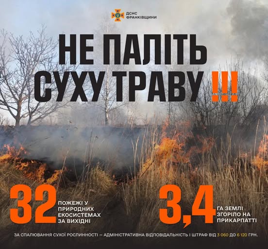 За минулу добу на Прикарпатті рятувальники ліквідували 32 пожежі у природних екосистемах на загальній площі 3,4га
