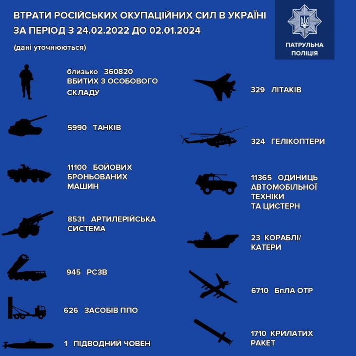 За інформацією Генерального штабу ЗСУ, загальні бойові втрати противника з 24.02.2022 до 02.01.2024 орієнтовно склали: