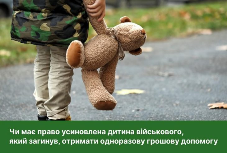 Так, усиновлена дитина військового, який загинув (чи помер) має право на одноразову грошову допомогу. Окрім дитини таку допомогу можуть отримати інші члени родини у рівних частках.