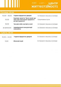 Фахівці Центру життєстійкості з 23 по 26 квітня (включно) пропонують серію тренінгів, навчальних програм, години відкритих дверей, індивідуальні консультації психолога тощо для різних категорій населення.