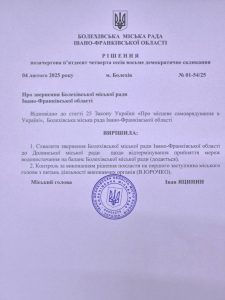 Відповідне звернення депутатів Болехівської міської ради VIII демократичного скликання було ухвалене на позачерговій 54-й сесії, яка відбулася сьогодні, 4 лютого 2025 року. Участь у засіданні взяли 16 депутатів міської ради із 26 обраних, керівники управлінь, відділів виконавчого комітету, комунальних підприємств.