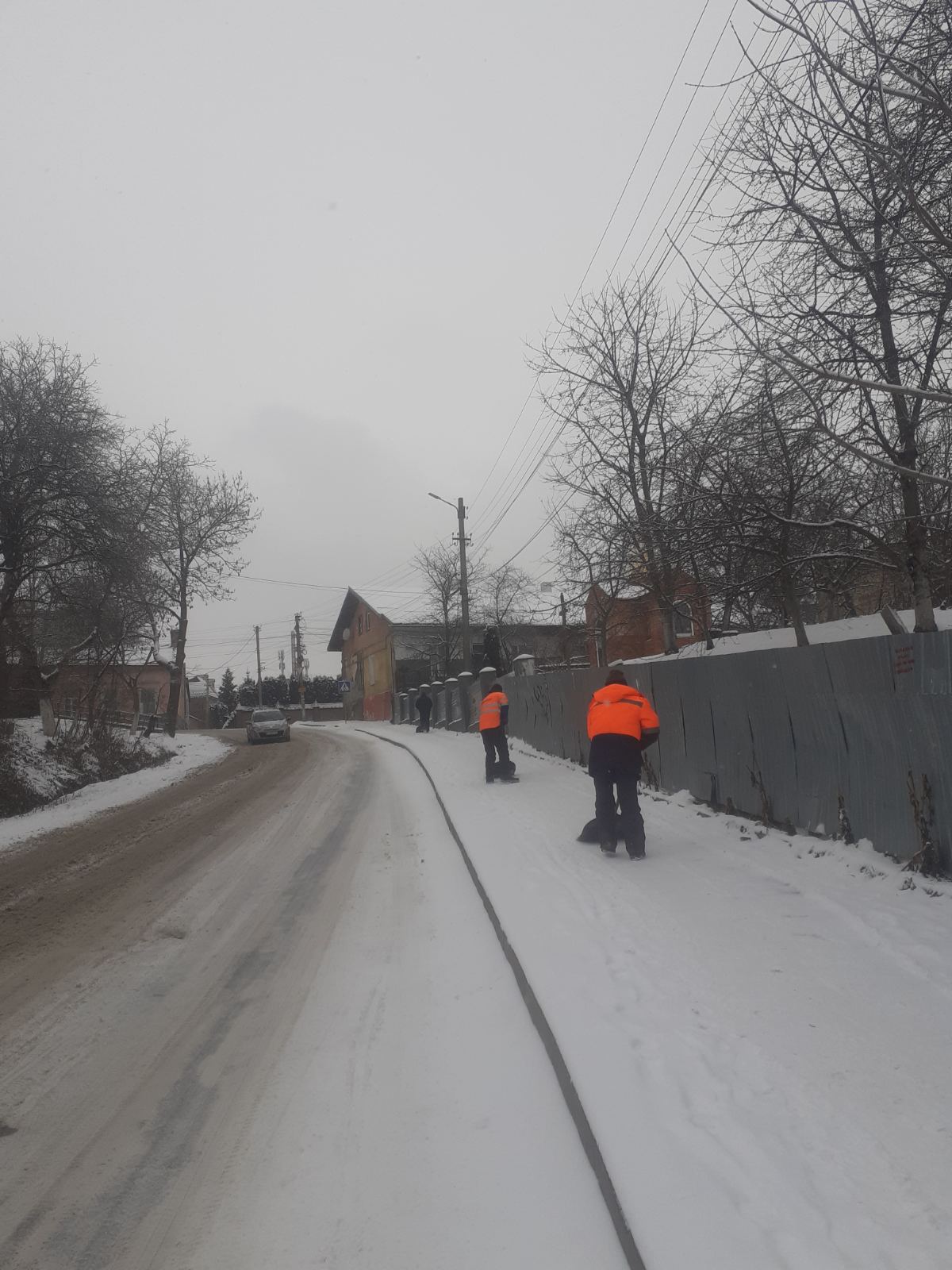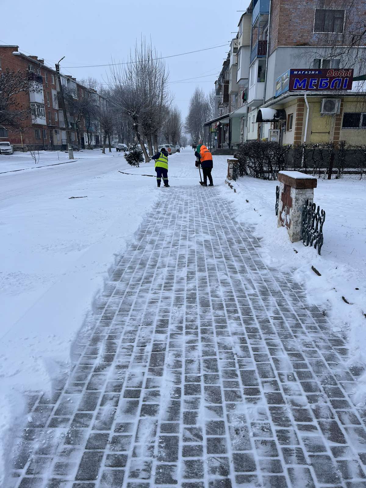 - – снігоочистку доріг, міжквартальних проїздів, тротуарів, пішохідних переходів та посипку протиожеледною сумішшю по місту. Задіяно 67 працівників підприємства та 7 одиниць техніки;