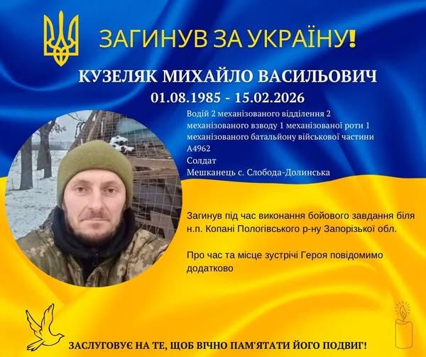 Трагічна звістка прийшла до села Слобода-Долинська. Захищаючи волю та незалежність України, поліг наш земляк — Михайло Кузеляк.