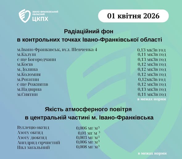 Станом на ранок 01.04.2026 показники радіаційного фону в Івано-Франківській області становлять від 0,11 мкЗв/год до 0,13 мкЗв/год, що не перевищує природний радіаційний фон характерний для Прикарпаття (0,32 мкЗв/год).