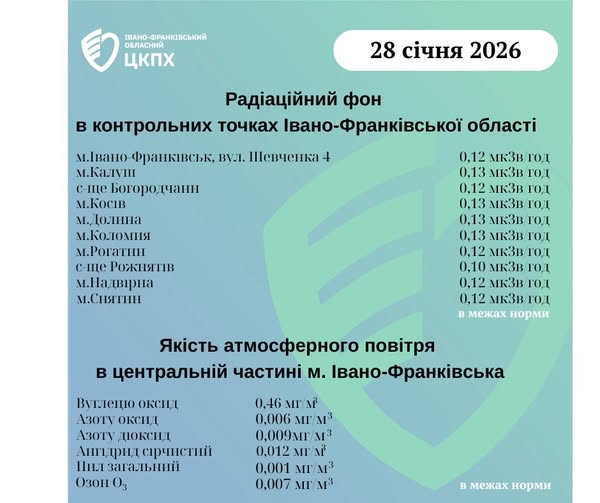 Станом на ранок 28.01.2026 показники радіаційного фону в Івано-Франківській області становлять від 0,10 мкЗв/год до 0,13 мкЗв/год, що не перевищує природний радіаційний фон характерний для Прикарпаття (0,32 мкЗв/год).