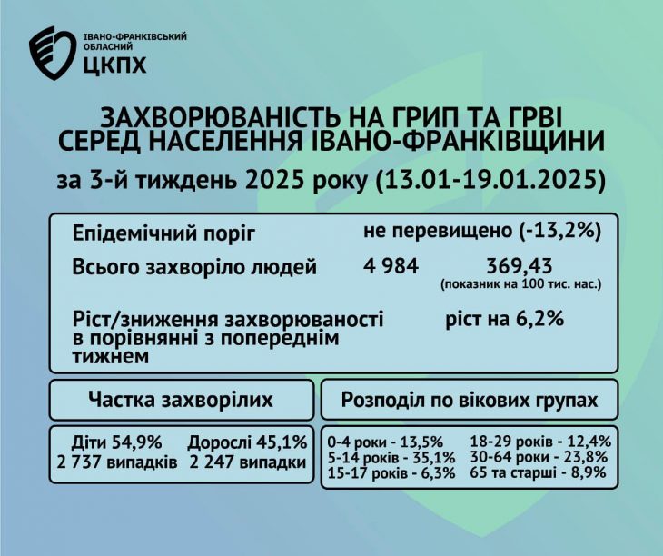 Впродовж 03 тижня 2025 року в області на грип, ГРВІ та COVID-19 захворіло 4984 особи, в тому числі 2737 дітей до 17 років, що становить 54,9%.