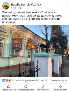 Представники бізнесу встановлюють на фасадад власних споруд рекламні вивіски, псуючи при цьому належний вигляд архітекрутної спадщини міста. Так сталось і цього разу, на вулиці В’ячеслава Чорновола, 80.