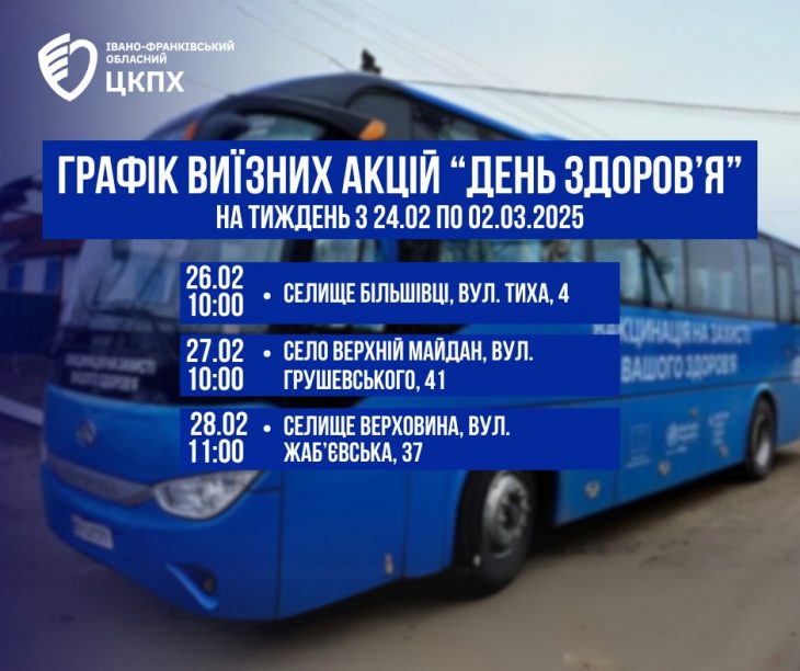 Графік виїзних акцій «День здоров’я» на тиждень з 24.02 по 02.03.2025 року
