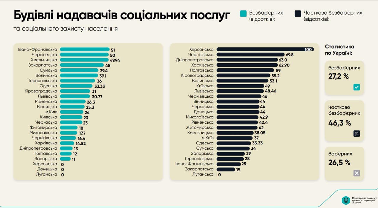 Також з показником 51% Івано-Франківщина посідає першість в облаштувані безбар’єрності у будівлях надавачів соціальних послуг та соціального захисту населення.