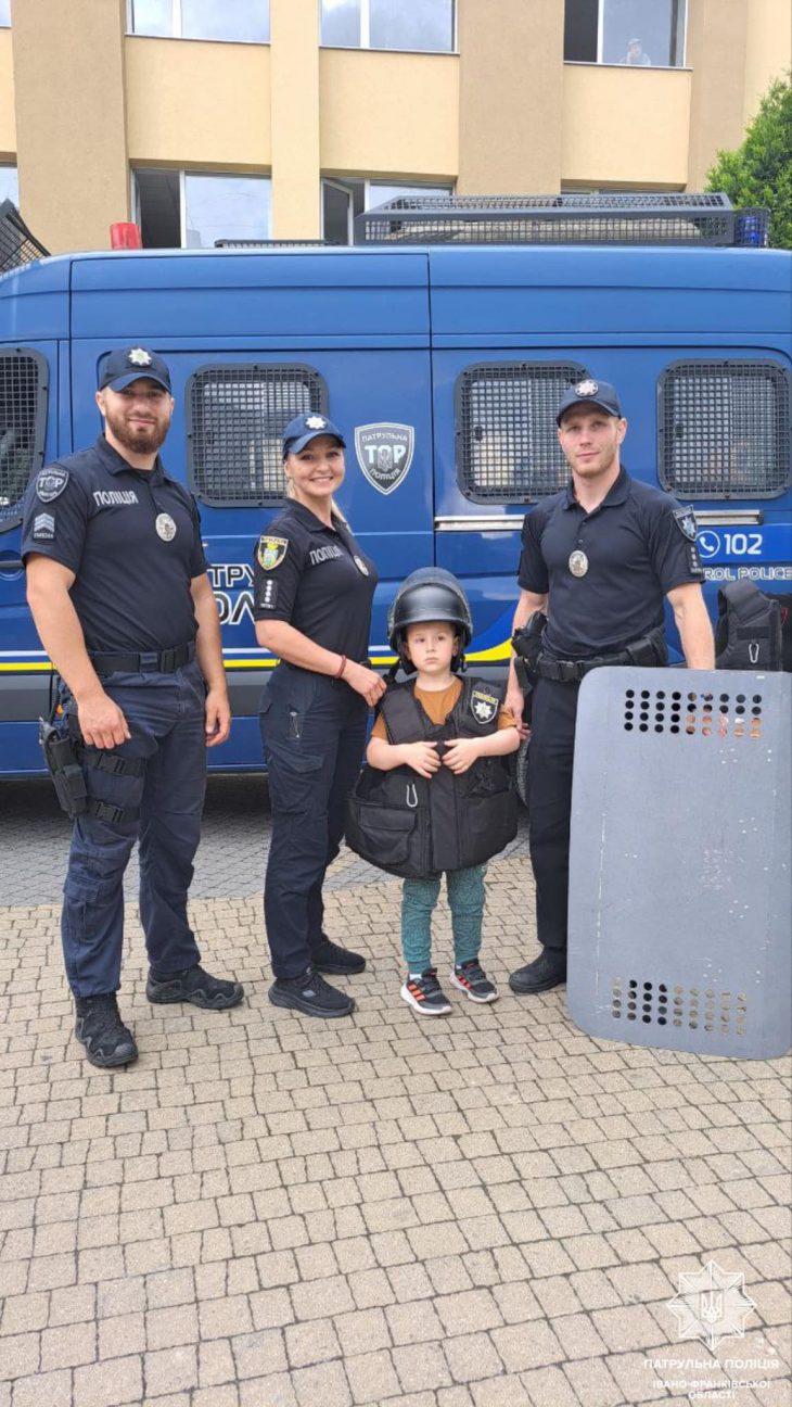 Патрульні відповідали на безліч дитячих запитань, а діти із захопленням випробували себе в ролі поліцейського, приміряючи амуніцію та роздивляючись броньований автомобіль роти ТОР.