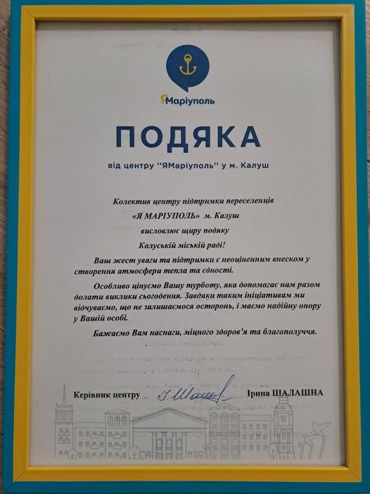 Калуська міська рада отримала подяку від центру підтримки переселенців «Я — Маріуполь»