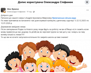 Заклад не прийматиме дітей у період з 22 грудня 2025 року по 12 січня 2026 року. Батьки обурені, адже після завершення Різдвяних свят у жодних вихідних, і дорослі мають повертатися до роботи. Питання, з ким залишити дошкільнят у цей час, залишається відкритим.