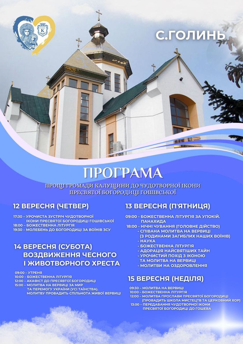 Голиняни зустрічатимуть Чудотворну Ікону Пресвятої Богородиці Гошівської в своєму селі 12 вересня о 17:30. Цього ж дня ввечері запланована спільна молебень до Богородиці за воїнів ЗСУ.