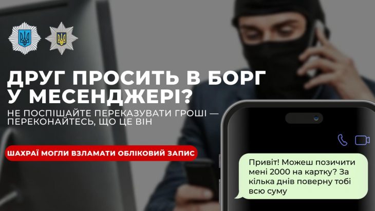 «Привіт! Позич, будь ласка, гроші» – таке повідомлення ви можете отримати від друга у месенджері: поліція застерігає – це шахраї. Отримавши схожий меседж від нібито родича чи товариша, переконайтесь, що це саме та особа, яку ви знаєте.