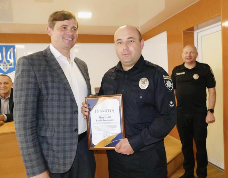 “Із великою приємністю вручив нагороди начальнику сектору взаємодії з громадами відділу превенції Калуського РВП ГУНП, майору поліції Юрію Яцущаку та поліцейським офіцерам громади сектору взаємодії з громадами відділу превенції Калуського РВП ГУНП, старшим лейтенантам поліції Миколі Зятюку та Михайлові Площинцю”,- Андрій Найда