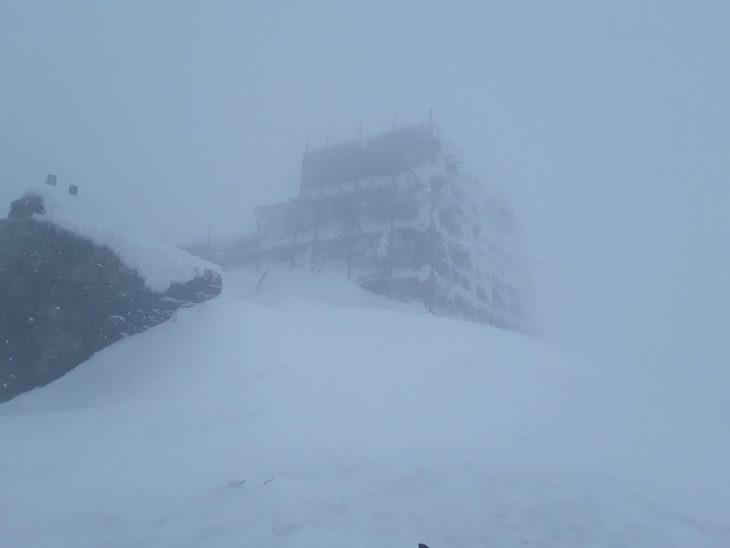 На горі туман, паде мокрий сніг (видимість обмежена).