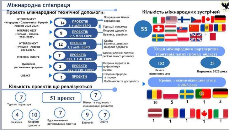 За останній рік спостерігається суттєве покращення якості проєктних заявок від громад області та розширення географії партнерств. Лише протягом минулого року було проведено 55 зустрічей із представниками дипломатичних місій та міжнародних організацій.