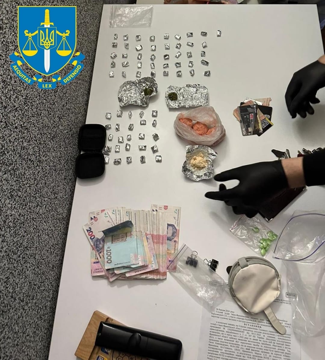 Правоохоронці провели обшуки у місцях зберігання та виготовлення наркотиків, житлі та автомобілях учасників організованої групи. Під час них виявлено та вилучено: амфетамін, канабіс, прекурсори, ваги, посуд, хімічні речовини, які використовувались для виготовлення наркотиків, зброю, мобільні телефони та банківські картки, накопичувачі інформації, записи («рецепти»), грошові кошти (в гривнях, доларах та євро) на загальну суму понад 1 млн грн.