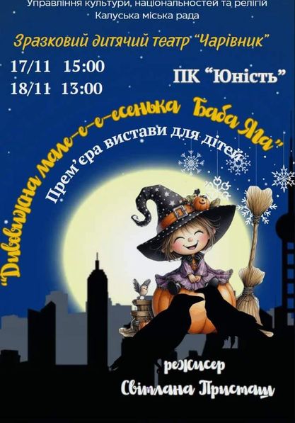 Цього ж дня у ПК «Юність» відбудеться прем’єра вистави для дітей «Дивовижна мале-е-е-есенька Баба Яга» зразкового дитячого театру «Чарівник», режисер Світлана Присташ.