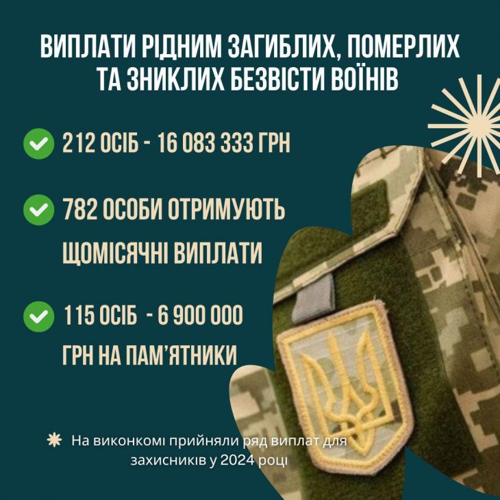 Ще 94 особи з сімей загиблих, померлих та зниклих безвісти військових отримають щомісячні виплати у розмірі прожиткового мінімуму. Від початку року такі виплати затвердили для 782 осіб.