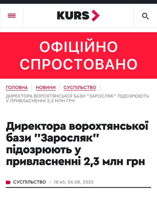 6 серпня 2025 року на сайті kurs.if.ua з’явився матеріал з заголовком: «Директора ворохтянської бази “Заросляк” підозрюють у привласненні 2,3 млн грн».