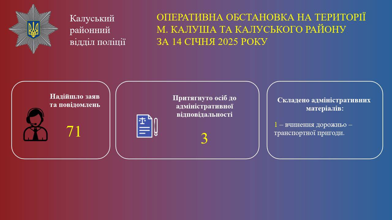 Протягом 14 січня на спецлінію 102 надійшло 71 повідомлення від мешканців району, усі сигнали опрацьовані.