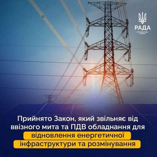 Парламент прийняв закони, які звільняють від ввізного мита та ПДВ обладнання для відновлення енергетичної інфраструктури та розмінування
