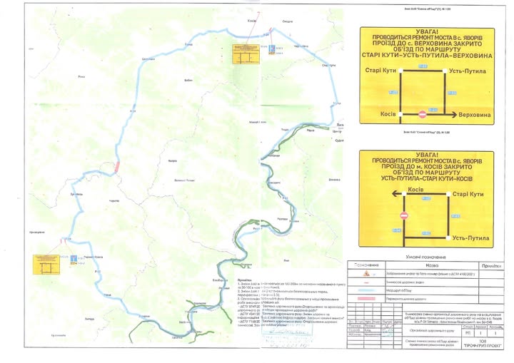 У відповідних місцях автомобільних доріг Р-24 Татарів – Кам’янець-Подільський та Р-20 Тязів – Старі Кути встановлюємо належні дорожні знаки і тимчасові схеми організації дорожнього руху на влаштування об’їзду.