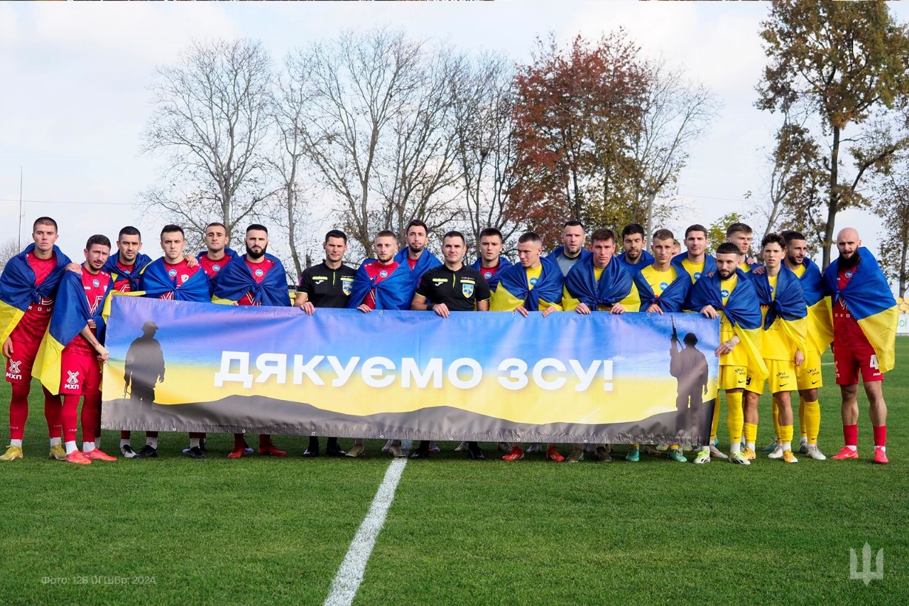 “Граємо заради Перемоги!: гасло футбольної команди з Івано-Франківщини, яка постійно допомагає військовим та підтримує Збройні Сили України. Саме тому лотом спільного з 128 ОГШБр розіграшу стала ексклюзивна футболка НК “Пробій” з номером 128 та автографом командира бригади полковника Дмитра Лисюка.