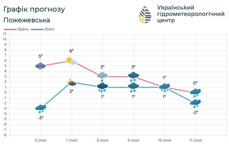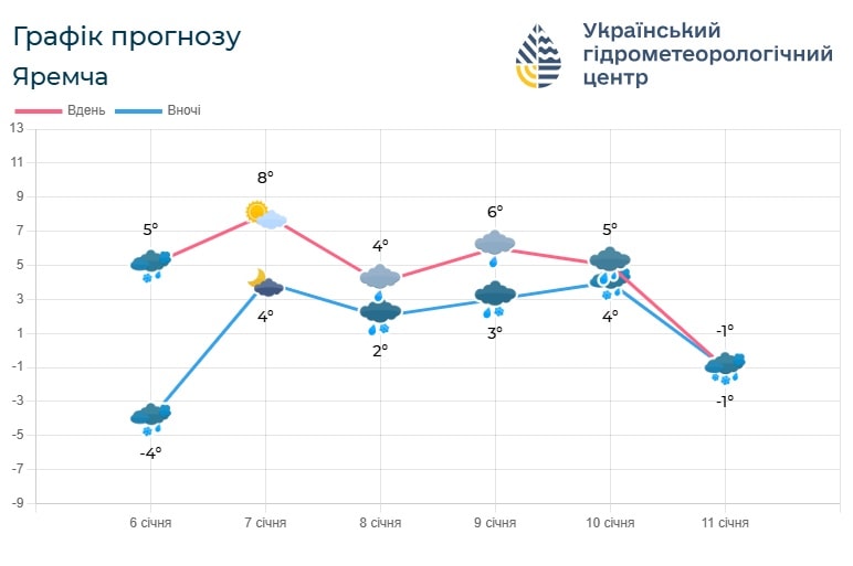 Температура повітря вночі від 1⁰ морозу до 5⁰ тепла; вдень 7-13⁰ тепла, наприкінці тижня 5-10⁰ тепла.