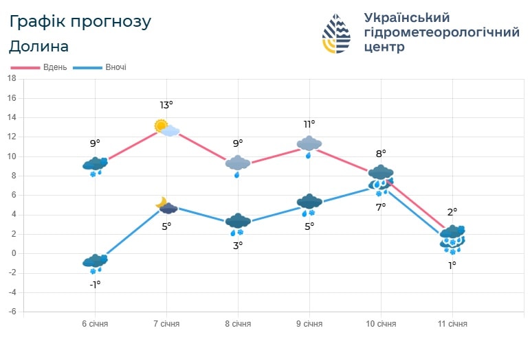 Протягом тижня очікується хмарна з проясненнями погода, у вівторок та четвер без опадів, а в середу та п’ятницю вночі мокрий сніг вдень дощ.