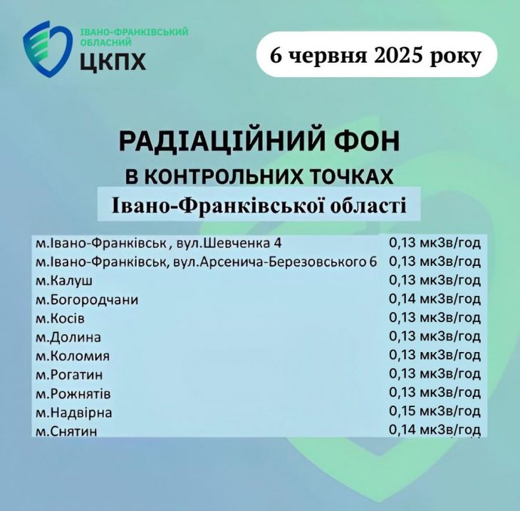 Станом на ранок 06.06.2025 показники радіаційного фону в Івано-Франківській області становлять від 0,13 мкЗв/год до 0,15 мкЗв/год, що не перевищує природний радіаційний фон характерний для Прикарпаття (0,32 мкЗв/год).