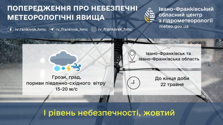 До кінця доби 22 травня по місту Івано-Франківську та області грози, град (6-19 мм), пориви південно-східного вітру 15-20 м/с.
