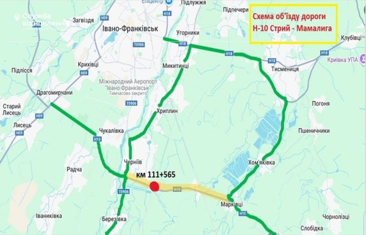 У зв’язку з інформацією від правоохоронних органів про замінування шляхопроводу на км 111+565 дороги Н-10 Стрий – Мамалига (між селами Черніїв та Марківці) змінюється рух транспорту цією ділянкою дороги.