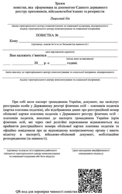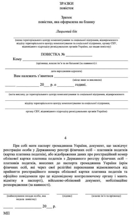 Кабінет Міністрів України затвердив зовнішній вигляд як роздрукованих повісток, так і оформлених на бланку. Обидва варіанти матимуть однакову юридичну силу.
