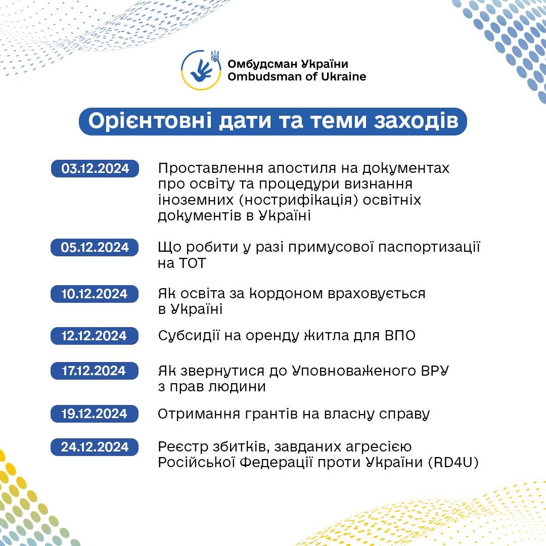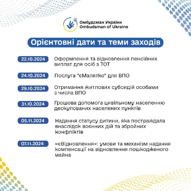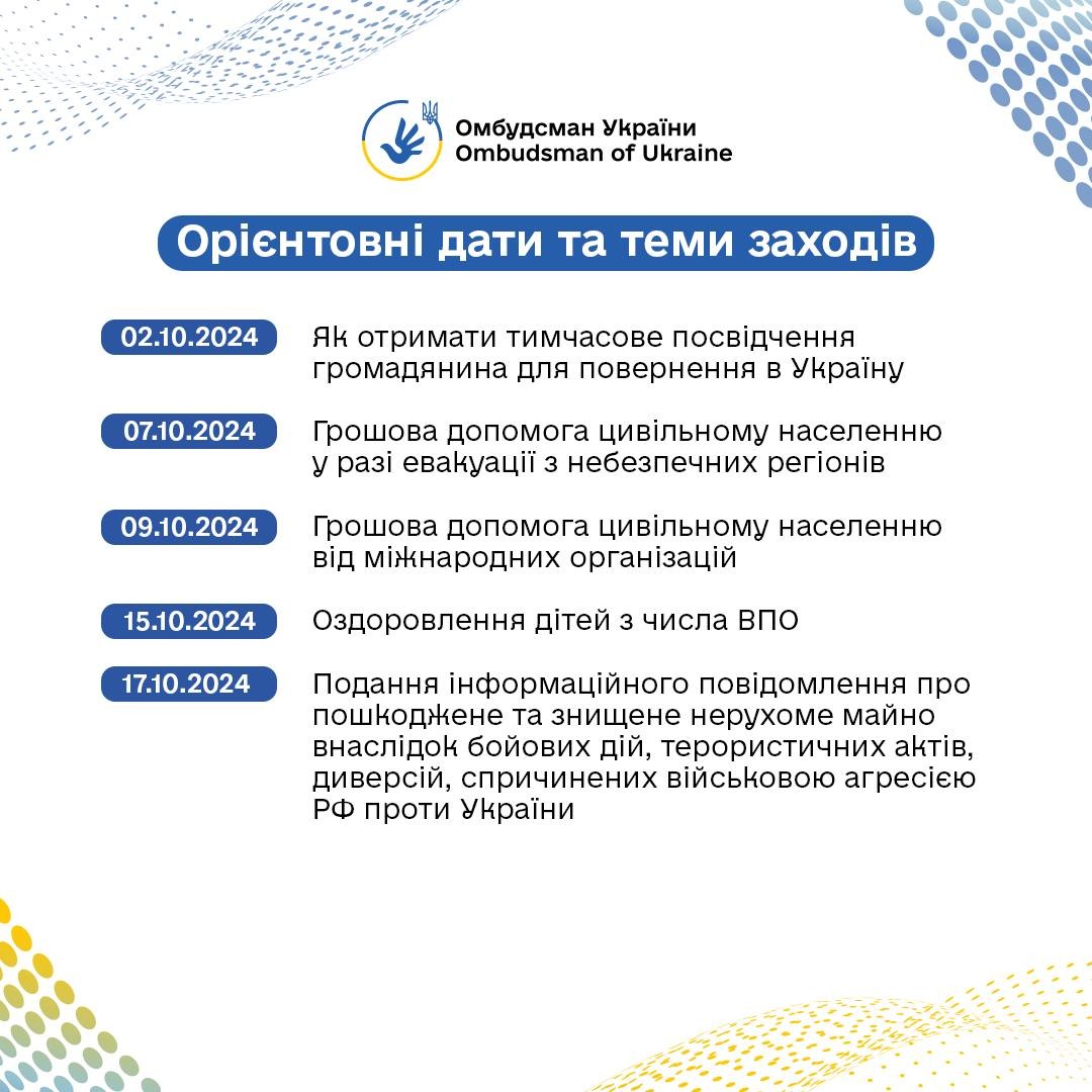 У рамках співпраці Секретаріату Уповноваженого Верховної Ради України з прав людини та Благодійної організації «Благодійний фонд «Стабілізейшен Суппорт Сервісез» в межах проєкту «Підтримка спроможності системи соціального захисту населення щодо реєстрації внутрішньо переміщених осіб», що реалізується за фінансування Агентства ООН у справах біженців в Україні (УВКБ ООН), заплановано організацію та проведення серії правопросвітницьких онлайн заходів для осіб, які постраждали внаслідок збройної агресії проти України.