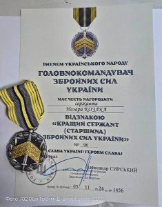 Влітку 2024 року, відбиваючи штурмовий наступ окупантів, сержант 75-го батальйону 102-ї бригади ТрО Назар Козак проявив неймовірну відвагу, утримуючи позицію під щільним вогнем та з переважаючими силами ворога.