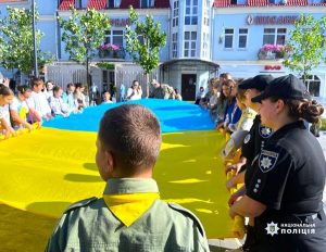 З вихованцями «Першої Ластівки» поліцейські спільно з дітками власноруч зробили символічний прапор з синьо-жовтих сердець. В Коломиї на площі перед Музеєм писанкового розпису дітки розгорнули синьо-жовтий стяг.