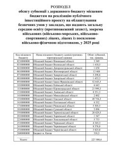 21 лютого 2025 року набрало чинності розпорядження Кабінету Міністрів України № 144-р, яке передбачає виділення субвенції з державного бюджету місцевим бюджетам для реалізації публічного інвестиційного проекту з облаштування безпечних умов у закладах загальної середньої освіти. Загальний обсяг фінансування становить 227,5 млн грн, з яких Івано-Франківській області виділено 52,6 млн грн.