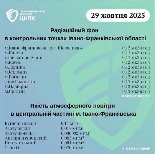 Станом на ранок 29.10.2025 показники радіаційного фону в Івано-Франківській області становлять від 0,11 мкЗв/год до 0,12 мкЗв/год, що не перевищує природний радіаційний фон характерний для Прикарпаття (0,32 мкЗв/год).