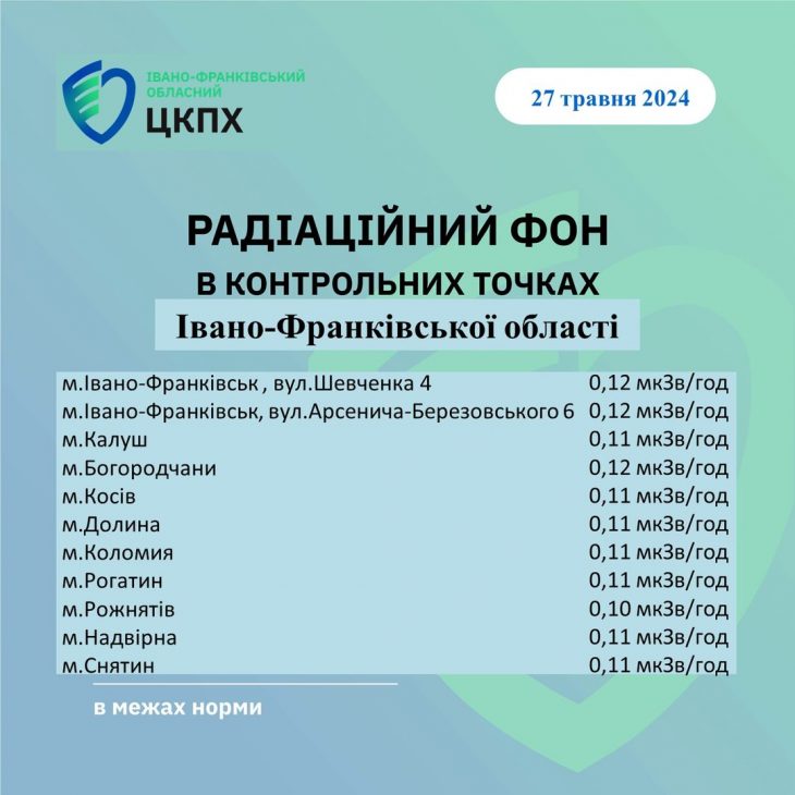 Станом на 27.05.2024 показник радіаційного фону становить від 0,10 мкЗв/год до 0,12 мкЗв/год (що не перевищує природний радіаційний фон для Прикарпаття в межах 0,32 мкЗв/год)