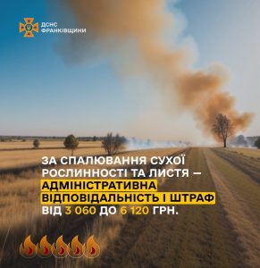 За спалювання сухої рослинності та листя — адміністративна відповідальність і штраф від 3 060 до 6 120 грн.