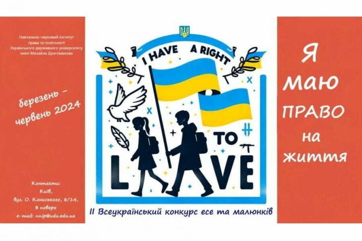Навчально-науковий інститут права та політології Українського державного університету імені Михайла Драгоманова у березні-червні 2024 року за підтримки Міністерства культури та інформаційної політики України проводить ІІ-ий Всеукраїнський конкурс есе та малюнків «Я маю ПРАВО на життя» (далі – Конкурс).