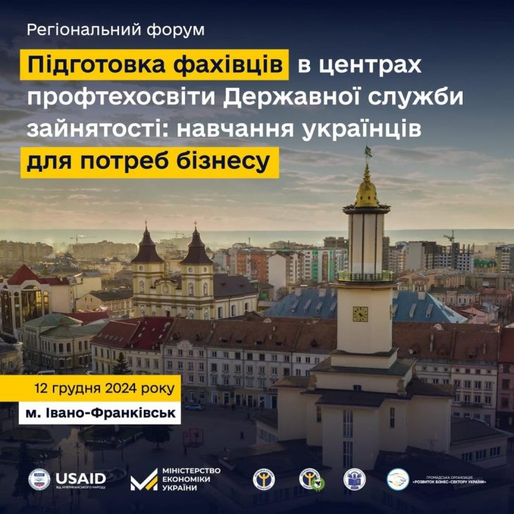 Як повідомляє Міністерство економіки України, 12 грудня 2024 року в Івано-Франківську відбудеться регіональний бізнес-форум «Підготовка фахівців в центрах профтехосвіти ДСЗ: навчання українців для потреб бізнесу».