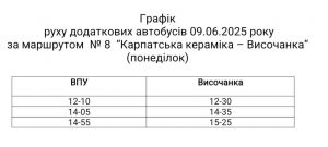 8 червня, у неділю, та 9 червня, у понеділок, будуть курсувати додаткові автобуси за маршрутом № 8 “Карпатська кераміка – Височанка”.